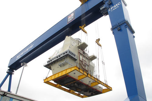 近日,英國最新航空母艦“伊麗莎白女王”號建造過程中的一組圖片受到中國軍事愛好者的關注,“女王”號航母進行艦島組裝用的重型龍門吊車,上面赫然標著上海振華重工制造的字樣。據(jù)了解,該起重機名為“歌利亞”,高70米,跨度120米,是目前英國最大的龍門吊。2011年12月由中國運往英國羅謝斯船廠。該龍門吊用于英國航母船體分段、艏部分段、“島”式上層建筑和飛機升降機的吊放與安裝。