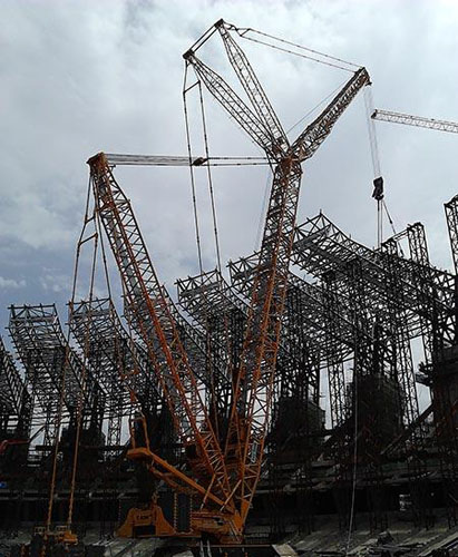 徐工XGC15000履帶起重機作為此場館建設(shè)的主力,現(xiàn)場采用超起塔臂工況,在滿負荷的情況下連續(xù)吊裝一個多月的時間,強悍的表現(xiàn)得到了施工方的認可,施工方負責人表示“徐工履帶起重機以其操作的平穩(wěn)性、性能的優(yōu)越性為工期的按時完成提供了強有力的保證”。目前,市場上已有四臺徐工1000噸級履帶起重機在各大工程中應(yīng)用,次次卓越的表現(xiàn)展現(xiàn)出非凡的起重性能和可靠性,徐工千噸級履帶起重機已真正挑起國家重點工程的重擔,為世界頂級工程貢獻中國力量。