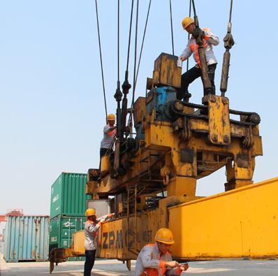 圖為4名維修工正在對大型龍門吊吊具進行檢修作業(yè)。