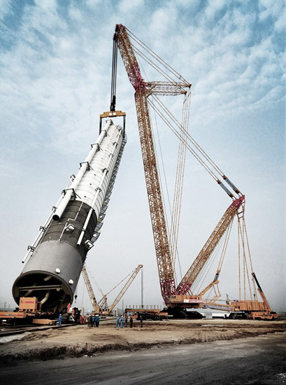 8月11日,上午9時(shí)57分,寧夏,中國(guó)在神華集團(tuán)煤制油項(xiàng)目中,徐工研制的全球最大4000噸級(jí)履帶起重機(jī),輕松將重達(dá)2155噸、高54.4米、直徑9.6米的油品合成裝置費(fèi)托合成反應(yīng)器緩緩吊起就位。