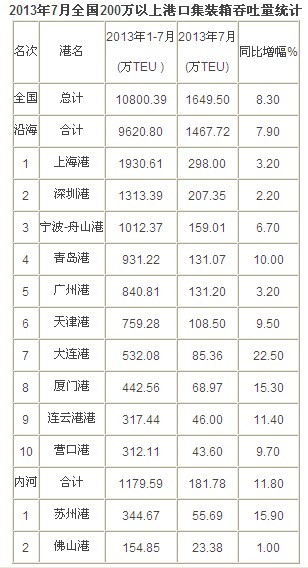 1至7月份,規(guī)模以上港口完成集裝箱吞吐量10800.39萬TEU,同比增長8.3%,較去年同期加快0.3個(gè)百分點(diǎn)。其中,沿海港口完成9620.80萬TEU,增長7.9%;內(nèi)河港口完成1179.59萬TEU,增長11.8%。