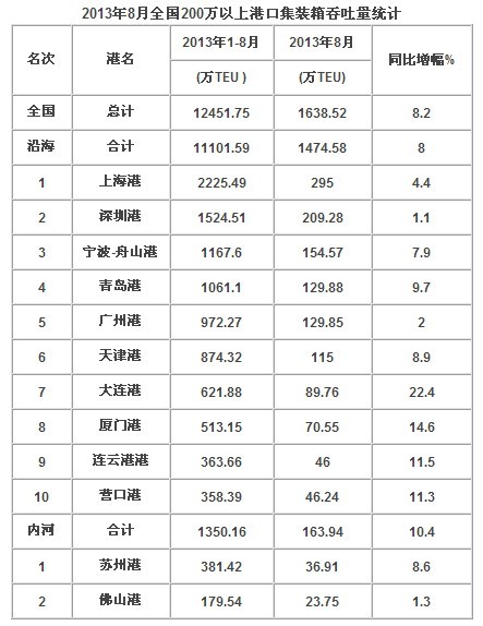 1至8月份,規(guī)模以上港口完成集裝箱吞吐量12451.75萬TEU,同比增長8.2%,較去年同期下降0.1個百分點。其中,沿海港口完成11101.53萬TEU,增長8.0%;內河港口完成1350.16萬TEU,增長10.4%。