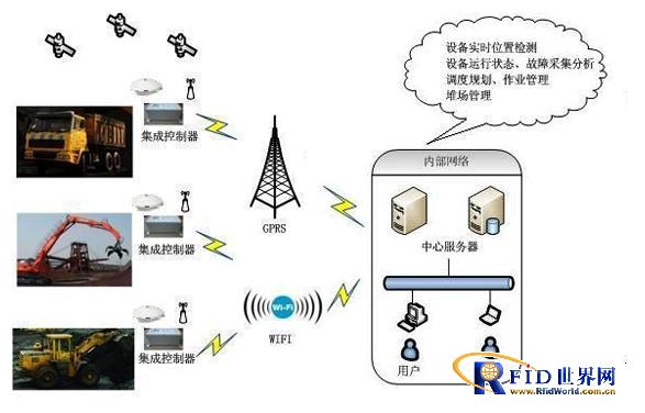 將集成控制器安裝在機(jī)械設(shè)備的司機(jī)室,采集設(shè)備的位置信息與運(yùn)行狀態(tài)等數(shù)據(jù)。通過GPRS或WIFI網(wǎng)絡(luò)將數(shù)據(jù)傳送至管理服務(wù)平臺(tái),平臺(tái)上運(yùn)行定位和堆場(chǎng)管理服務(wù)軟件,提供圖形化顯示、調(diào)度規(guī)劃與堆場(chǎng)管理功能,通過B/S或C/S的客戶端給各用戶提供服務(wù)。
