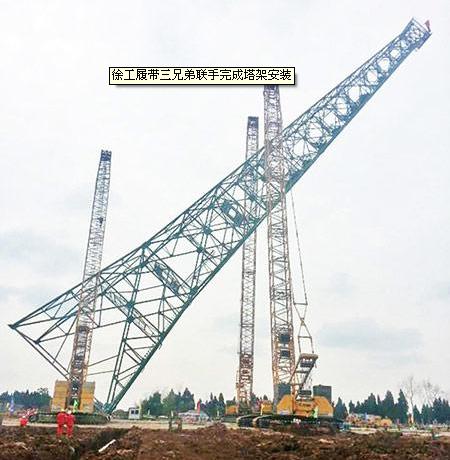 下午三點(diǎn)多鐘,吊鉤就位,吊裝正式開始。徐工QUY260、450、650履帶起重機(jī)緩緩將塔架抬起后,開始做邊起升邊側(cè)向帶載行走復(fù)合動(dòng)作。在整個(gè)吊裝過(guò)程中,三臺(tái)起重機(jī)高度協(xié)調(diào),僅半個(gè)小時(shí),便將塔架安裝就位,每步動(dòng)作都平順流暢、高效平穩(wěn)。