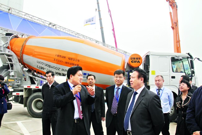 營銷總公司副總經(jīng)理符忠軒(前左)向中國施工企業(yè)管理協(xié)會會長曹玉書(前右)介紹參展產(chǎn)品。