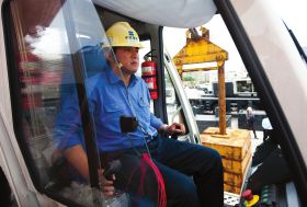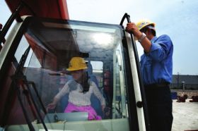 4月28日,龍衛(wèi)國(guó)教本報(bào)記者操作汽車(chē)起重機(jī)。