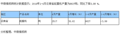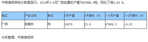 2014年1-4月廣西、新疆、云南三省起重機(jī)產(chǎn)量統(tǒng)計(jì)情況