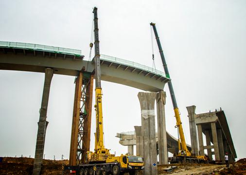 徐工QAY200與QAY240兩臺全地面悍將正聯(lián)手完成橋面主體鋼箱梁的吊裝任務(wù),主體鋼箱梁重約84噸,作業(yè)高度20米,伸臂36米,工作幅度15米,平均每截鋼箱梁吊裝時間約為4個小時。