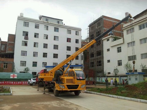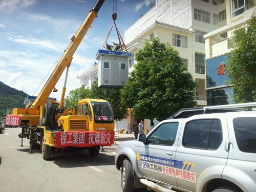 圖為徐工QY12B.5汽車起重機(jī)在小寨中學(xué)災(zāi)民安置區(qū)吊裝衛(wèi)生設(shè)施