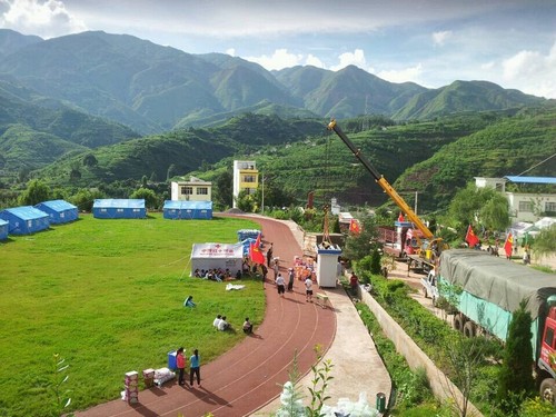 徐工救援隊(duì)汽車起重機(jī)在安置點(diǎn)緊急協(xié)助醫(yī)療和衛(wèi)生設(shè)施吊裝。