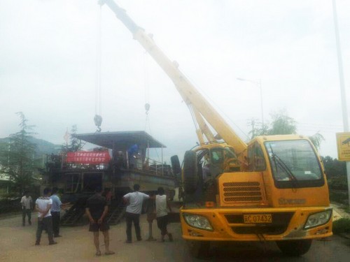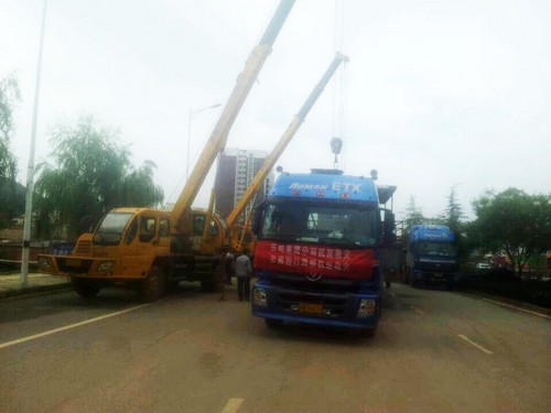8月10日,徐工兩臺(tái)12噸起重機(jī),在魯?shù)榭h協(xié)助三峽公司將3個(gè)浮船由轉(zhuǎn)運(yùn)車輛吊下,放置在平板車上,以便運(yùn)輸。