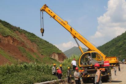 7日,由于受災(zāi)地區(qū)風(fēng)雨不斷,各處山體滑坡和泥石流等險情更是不斷發(fā)生,部分地區(qū)又出現(xiàn)了斷電的情況,為了能讓災(zāi)區(qū)群眾盡快恢復(fù)用電,云南省抗震救災(zāi)指揮部臨時調(diào)用了一臺徐工QY12B.5汽車起重機供電力部門使用。
