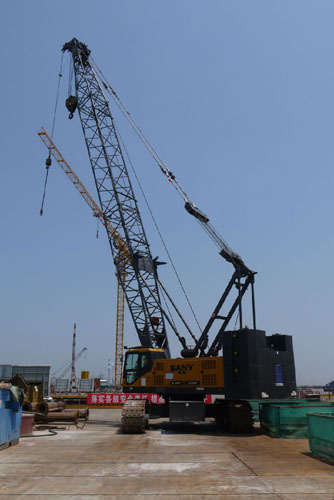 在工地現(xiàn)場(chǎng),中交二航局滬通長(zhǎng)江大橋項(xiàng)目部副經(jīng)理黃先術(shù)為第一工程機(jī)械網(wǎng)記者介紹,大橋建設(shè)時(shí)間緊、任務(wù)重,一天都不能耽誤,施工人員放棄休假,加班加點(diǎn)搶工期。“現(xiàn)在,我們首先要做的就是樁基施工,在岸上可以進(jìn)行鉆孔,在水上的部分就需要搭建施工平臺(tái)然后再鉆孔,這就需要履帶起重機(jī)來(lái)進(jìn)行施工作業(yè)。”黃經(jīng)理如是說(shuō)。