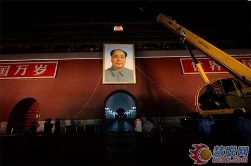 這樣的儀式每年一次,已經(jīng)持續(xù)了48年。在1966年8月以前,每逢重大節(jié)假日,天安門城樓上才懸掛毛澤東畫像,平時(shí)在城樓上是沒有的。1966年8月以后,經(jīng)中央決定,天安門城樓上的毛澤東畫像天天懸掛,每年國慶節(jié)前要更換一幅新的。