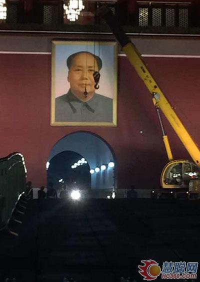 9月27日零時(shí),北京,懸掛在天安門城樓正中央的巨幅毛主席畫像完成了“新舊交接”事宜。徐工輪式起重機(jī)從天安門城樓門洞中駛出,將新的毛主席畫像與舊畫像更換。截止1時(shí)08分,天安門毛主席像更換工作全部結(jié)束。