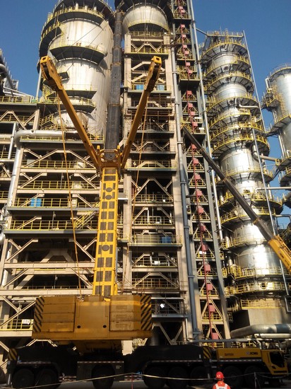 徐工QAY650、QY70K兩臺(tái)起重機(jī)產(chǎn)品正緊張地忙碌在該廠二聯(lián)合裝置的檢修工作一線,由于該廠是停電檢修,因此多個(gè)檢修作業(yè)需同時(shí)施工。通過專業(yè)密切的配合,參檢人員與徐工起重機(jī)協(xié)同作戰(zhàn)、克服檢修時(shí)間緊、項(xiàng)目多、難度大的特點(diǎn),確保了檢修施工安全、質(zhì)量和進(jìn)度。