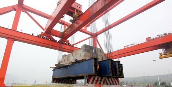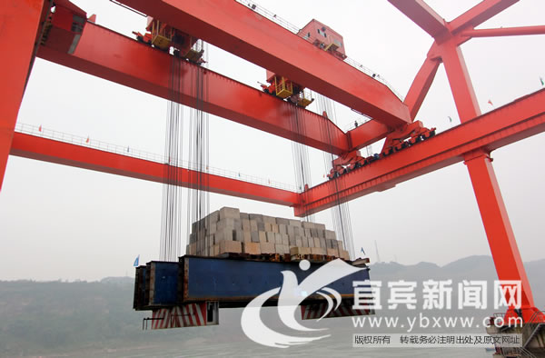 據(jù)了解,宜賓港1000噸級重件泊位采用多功能橋式起重機方案,是長江碼頭第一個、也是最大的一個多功能橋式起重機。重件泊位碼頭長36米,設(shè)計通過能力33.8萬噸,最大起吊能力1000噸,設(shè)計年吞吐能力33.8萬噸,總投資約1.16億元。1000噸多功能橋式起重設(shè)備順利通過型式試驗后,檢測方將在11月中旬左右給其發(fā)放合格證書,屆時該設(shè)備將正式投入運行。