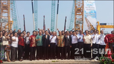 10月10日,徐工1250噸&650噸履帶吊交接儀式在印尼巴淡島S公司廠區(qū)隆重舉行。進出口公司總經(jīng)理劉建森、亞太部部長馬中一、S公司總經(jīng)理何爾信、中國駐棉蘭領事館領事劉偉國、京都國際海事有限公司總經(jīng)理單愛華為交接儀式進行剪彩。剪彩完畢,兩臺650噸履帶吊進行了安裝后的首吊,兩車起吊速度、高度整齊劃一,在明媚的陽光下,徐工金巨臂擎天展現(xiàn)中國力量,閃耀馬六甲海峽,現(xiàn)場掌聲雷動,大家爭相拍照留念。