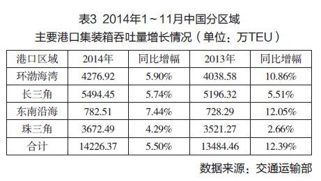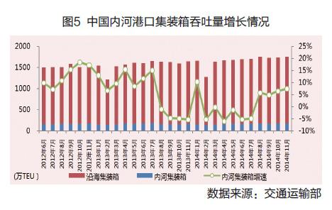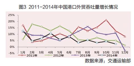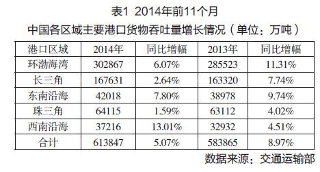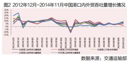 2014年前11個月,中國規(guī)模以上港口完成貨物吞吐量102.27 億噸,同比提升4.80%,增幅較去年同期回落近半。全球經濟復蘇進程波折起伏,東西向國際貿易擴張速度明顯放慢;同時,國內經濟面臨產業(yè)結構調整下的 “減速”與“換擋”,港口生產隨之溫和。上半年我國港口吞吐量增長動力主要來自于對外商品貿易,而隨著歐美等國“再工業(yè)化”及區(qū)域貿易的活躍,抑制了中國商品的出口以及原材料的進口貿易。加之國內房地產、基礎設施建設需求下滑,以及內貿煤價格的下降,致使港口煤炭、鐵礦石等大宗散貨進口量逐月回落,外貿拉動力趨弱,內貿貨物轉而成為支撐。另一方面,全年沿海港口貨物吞吐量增幅總體處于震蕩下行通道,前11個月累計增幅為5.7%;而內河港口同樣表現不佳,前11個月累計增幅僅2.9%,較2013年同期8.3%存在較大差距,但四季度內河港口生產波動上揚態(tài)勢明顯,有望逐步擺脫萎靡。