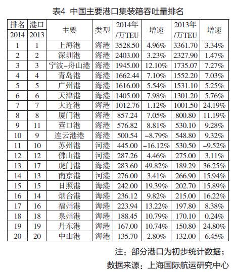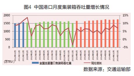 2014年,隨著國內外經濟結構轉型深入、地緣政治影響擴大、金融市場波動加劇,以及國際經貿格局錯綜變化等因素影響,中國經濟逐漸呈現出“低增長、優(yōu)發(fā)展”的格局,全年國內生產總值(GDP)增速維持在7.4%,固定資產投資上升15.28%,社會消費品零售總額抬高11.96%,進出口總額微漲 3.39%,各增長指標較2013年均有不同程度下降。國內制造業(yè)PMI指數呈先增后降態(tài)勢,12月終值為50.1點,勉強維持在臨界線以上。經濟步入 “新常態(tài)”發(fā)展階段,投資動力減弱、排浪式消費減少、出口回升放緩,使得全國港口生產形勢較2013年有所減慢,貨物與集裝箱吞吐量在低速增長區(qū)間內小幅上行。