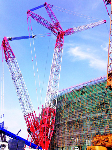 客戶看著“昂首挺胸”的QUY800履帶式起重機(jī)矗立在江蘇大劇院的工地上,驕傲地說:“這次中聯(lián)的產(chǎn)品給我們中國人掙足了面子,我們的選擇沒有錯(cuò)?!痹瓉恚€有一臺國外競爭對手的產(chǎn)品也在競爭這次吊裝任務(wù),就是因?yàn)闆]有及時(shí)組裝起來而失去了機(jī)會(huì)。