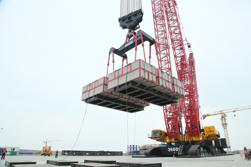 2014年6月,中國(guó)康富購(gòu)買的三一重工首臺(tái)SCC36000A發(fā)往山東榮成CAP1400核電現(xiàn)場(chǎng),在國(guó)核示范業(yè)主見(jiàn)證下,順利通過(guò)山東特種設(shè)備檢驗(yàn)研究院的現(xiàn)場(chǎng)定檢檢驗(yàn),取得首檢報(bào)告與使用登記證?,F(xiàn)場(chǎng)完成77490t•m的載荷吊裝,是目前在施工現(xiàn)場(chǎng)完成起重力矩最大的國(guó)產(chǎn)履帶起重機(jī)。負(fù)責(zé)現(xiàn)場(chǎng)運(yùn)維的中國(guó)能建浙江火電表示:三一重工設(shè)計(jì)、制造的3600噸履帶起重,可以完全覆蓋三代核電所有機(jī)型的吊裝。