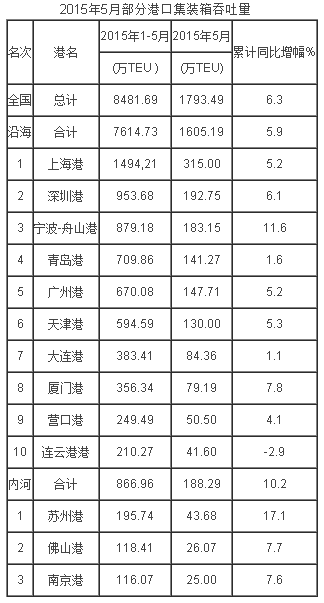 5月份,規(guī)模以上港口完成集裝箱吞吐量1793.49萬TEU,同比增長5.5%。其中,沿海港口完成1605.19萬TEU,增長5.2%:內(nèi)河港口完成188.29萬TEU,增長7.9%。