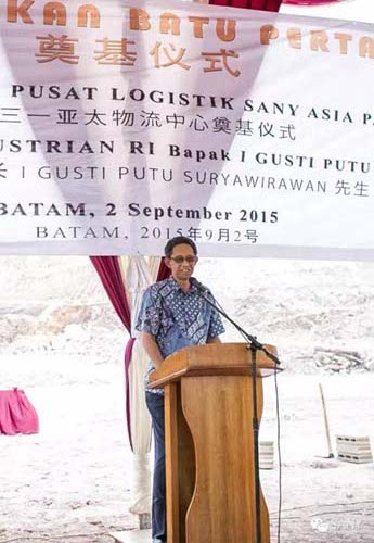 印尼工業(yè)部重工司司長布都、印尼巴淡島市長阿哈默德、巴淡島特許機(jī)構(gòu)負(fù)責(zé)人穆斯托法等6名政府官員出席了當(dāng)天的項(xiàng)目奠基儀式。布都感謝三一在巴淡島的投資,他希望該物流中心的建立,不僅能滿足印尼國內(nèi)的需求,還能通過出口為東南亞甚至全球帶來福音。同時(shí),他還希望三一能帶動更多的商業(yè)伙伴到印尼投資,共謀發(fā)展。