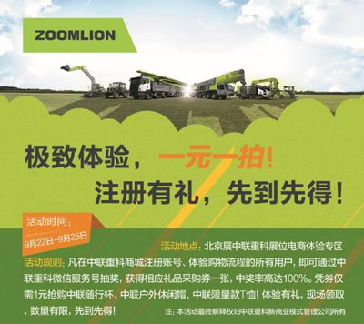 9月8日中聯(lián)重科商城“青”情上線獲得業(yè)內(nèi)及廣大客戶好評,在本次北京展中,中聯(lián)重科商城也會“青”力相助,開展現(xiàn)場商品“1元限時購”的活動,線上線下齊發(fā)力,共同打造一場別開生面的新型展會。