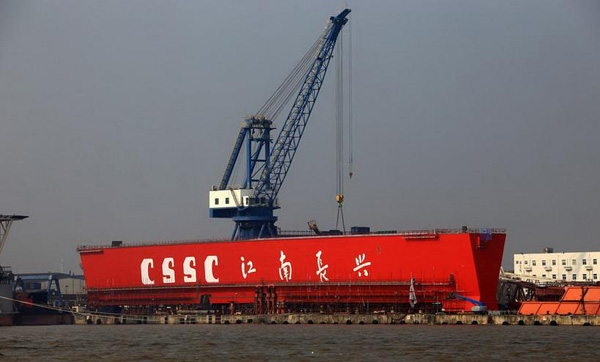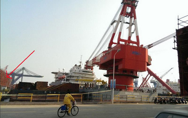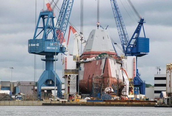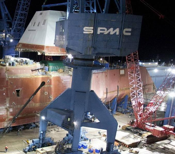 2013年美國公開新一代朱姆沃爾特級驅(qū)逐艦DDG-1000的建造情況時,吊裝戰(zhàn)艦上層建筑的吊機上印有“SPMC”的字樣?!癝PMC”正是原上海港機股份有限公司的英文名稱,目前已被振華港機收購。圖為美國DDG-1000驅(qū)逐艦的建造現(xiàn)場,其所用的吊機上印有“SPMC”的字樣。