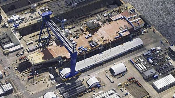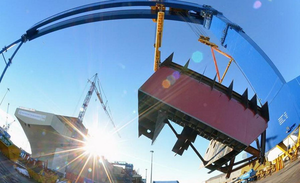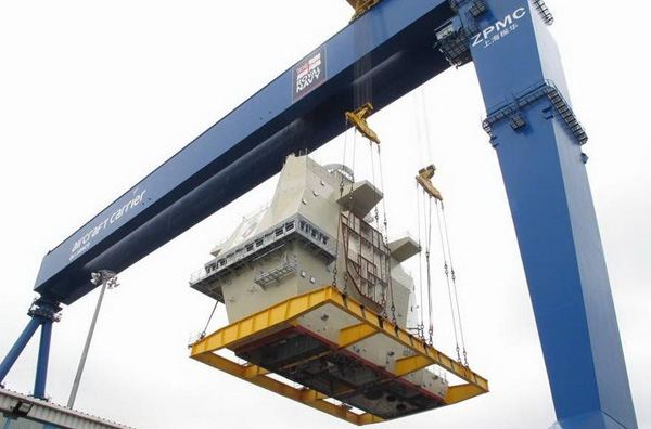 英國皇家海軍最新伊麗莎白女王號航母后艦島于2013年6月28日在樂塞船廠完成安裝,至此,兩個艦島均已經(jīng)安裝完畢。組裝該航母的龍門吊由中國企業(yè)振華港機提供,為1500噸級。