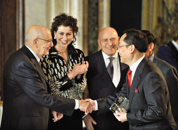 意大利總統(tǒng)納波利塔諾為中聯(lián)重科詹純新頒發(fā)“萊昂納多國際獎”,這是中國企業(yè)家首次獲該國際獎項。