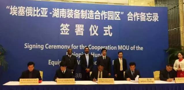 阿爾卡貝博士代表埃塞俄比亞政府與三一集團(tuán)、湖南省商務(wù)廳、中地海外、長沙經(jīng)濟(jì)技術(shù)開發(fā)區(qū)共同簽訂了《埃塞俄比亞—湖南裝備制造合作園區(qū)》合作備忘錄。