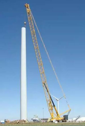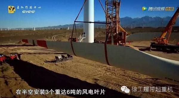 根據(jù)視頻可以判斷,6噸重的風(fēng)電葉片屬于1.5MW級別的風(fēng)機。金黃色的履帶吊是徐工早期的QUY300噸型號,畫面中可以看到300噸采用的是短副臂風(fēng)電工況,整場吊裝精確而高效。