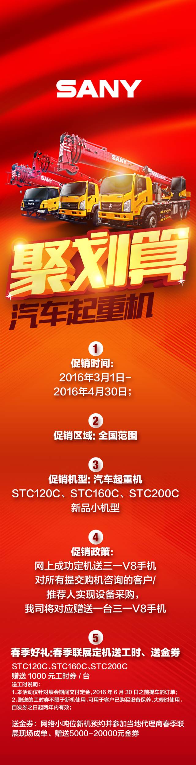 本次活動(dòng)中,參與當(dāng)?shù)卮砩膛e辦的三一重起春季聯(lián)展交付定金,并在2016年6月30日之前提車的訂單,贈(zèng)送1000元工時(shí)券/臺(tái)、三一V8手機(jī)。更貼心的是,贈(zèng)送的工時(shí)券不限于新機(jī)使用,可用于客戶已購買設(shè)備保養(yǎng)、大修時(shí)使用;而通過線上咨詢,參加此次春季聯(lián)展并現(xiàn)場成單的,贈(zèng)送5000-20000元代金券;對(duì)所有提交購機(jī)咨詢的客戶/推薦人,實(shí)現(xiàn)設(shè)備采購的,將贈(zèng)送一臺(tái)三一V8手機(jī)。