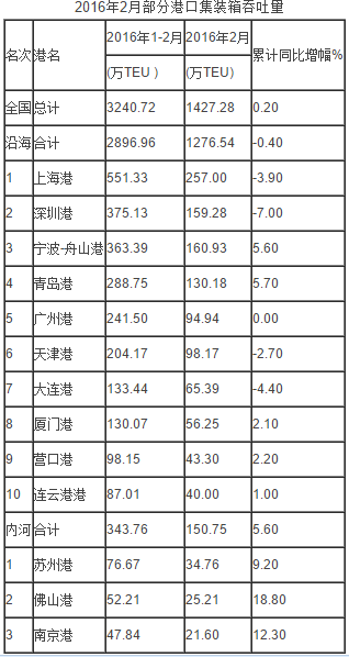 1至2月份,規(guī)模以上港口完成集裝箱吞吐量3240.72萬(wàn)TEU,同比增長(zhǎng)0.2%,增速較去年同期回落10.3個(gè)百分點(diǎn)。其中,沿海港口完成2896.96萬(wàn)TEU,與去年同期基本持平;內(nèi)河港口完成343.76萬(wàn)TEU,增長(zhǎng)5.6%。