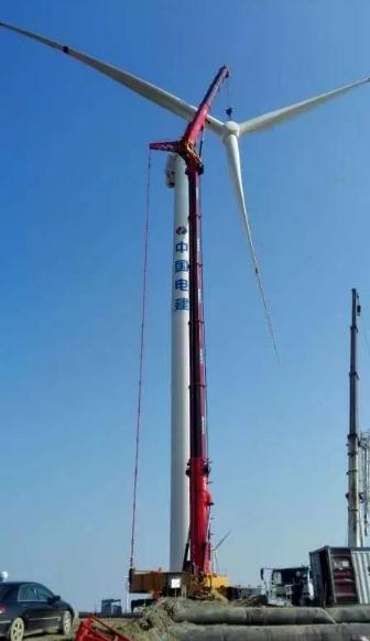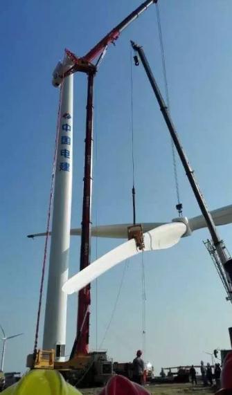 上海煜成建筑機(jī)械安裝工程有限公司于江蘇南通吊裝2.5MW西門子與上海電氣合資風(fēng)機(jī),吊裝葉片,重為65噸,立柱全伸60米,吊臂36米,105噸配重,高度85米,幅度14米5。