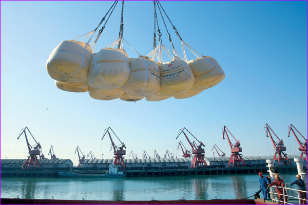 圖為出口純堿正在碼頭裝船。