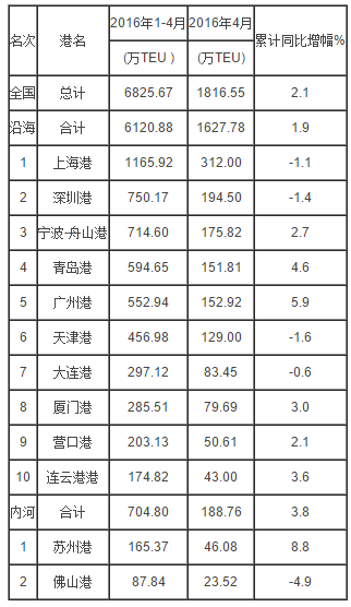 2016年4月部分港口集裝箱吞吐量