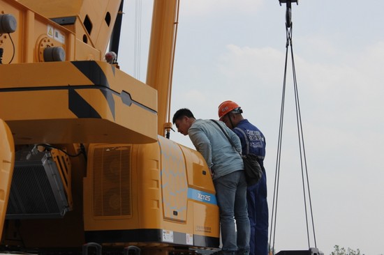 4月19日,當(dāng)客戶在排隊(duì)等待提車的過程中,一個(gè)小插曲讓梁老板原本踏實(shí)的心瞬間緊張起來(lái)。由于沒有在預(yù)訂時(shí)寫清車輛編號(hào),目前無(wú)法提車。梁老板臉色突變,沉默了片刻,突然拉著工作人員走向其中一臺(tái)XCT25L5起重機(jī),拉開車門,迅速的登上駕駛室,從座位旁邊順手拿出半瓶礦泉水和一張自己的名片,向所有的工作人員大喊“我訂的就是這一臺(tái),昨天就貼上了我的名字”。這一舉動(dòng)把大伙逗樂了,最終在大家的共同努力下,梁老板如愿以償?shù)摹氨У妹廊藲w”。在出發(fā)前,我們握手道別,并約定不久后,長(zhǎng)春再聚。