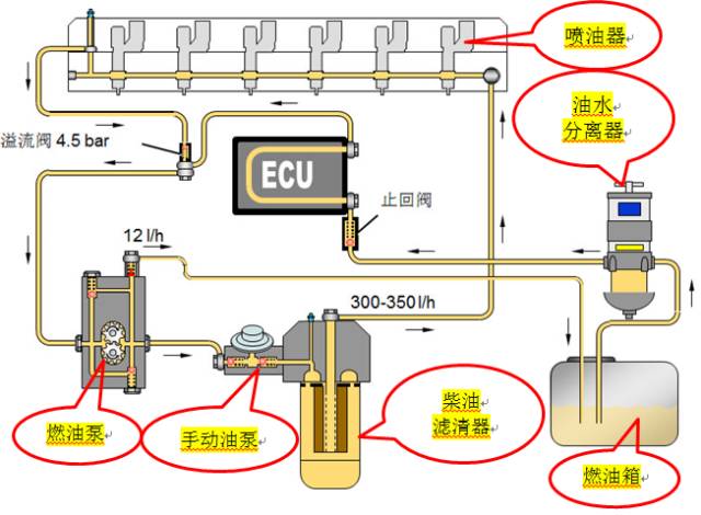 我們?cè)谏蠄D所看到的是一個(gè)低壓燃油系統(tǒng)流動(dòng)示意圖,燃油被吸入到油水分離器中,通過止回閥流經(jīng)ECU散熱器(ECU指電子控制單元),再上到溢流閥,然后與流經(jīng)溢流閥的回流燃油一起流入燃油泵的吸油側(cè)。