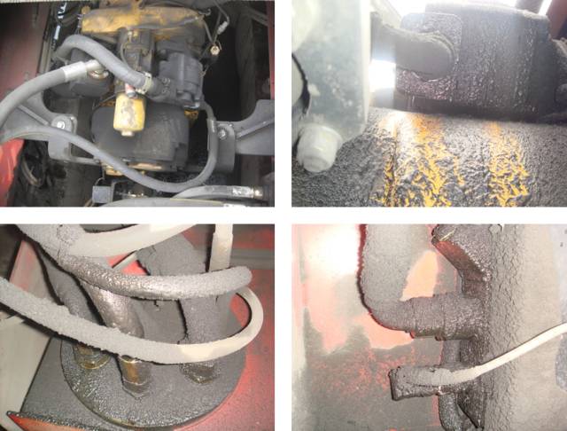 二、檢查機(jī)車的液壓系統(tǒng),發(fā)現(xiàn)左側(cè)液壓油泵漏油,多處液壓油管同時(shí)漏油,散熱器油管接頭也漏油,這樣多處泄漏造成了機(jī)車充壓頻繁,如下圖: