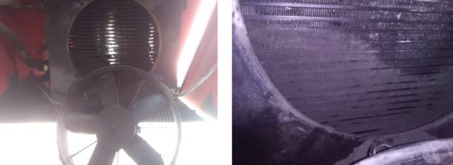 發(fā)現(xiàn)散熱器與風(fēng)扇之間的灰塵很多,拆下散熱器風(fēng)扇,發(fā)現(xiàn)散熱器內(nèi)部四分之一處填滿了泥土,堵塞住了散熱器。工程師清理干凈了散熱器內(nèi)泥土,使用壓縮空氣吹出散熱器內(nèi)的灰塵雜物,疏通了散熱器散熱片,如下圖: