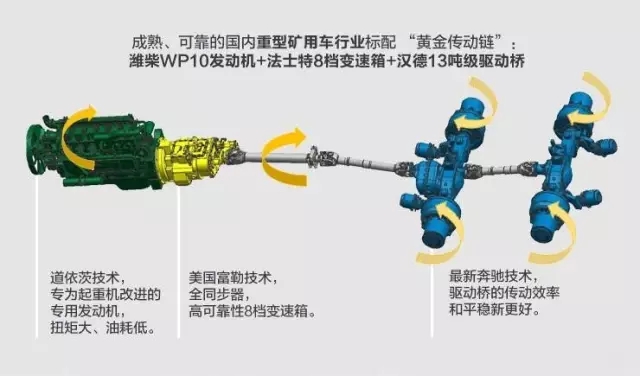 強勁、可靠的地盤動力及傳動系統(tǒng)。成熟可靠的國內重型礦用車行業(yè)標配“黃金傳動鏈”:濰柴WP10發(fā)動機+法士特8檔變速箱+漢德13噸級驅動橋。