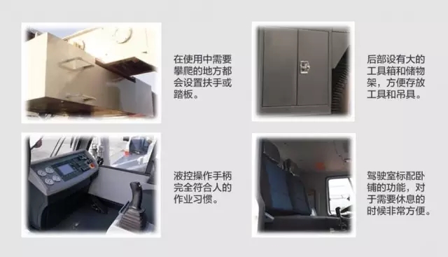 在使用中需要攀爬的地方都會設(shè)置扶手或踏板,后部設(shè)有大的工具箱和儲物架,方便存放工具和吊具,液控操作手柄完全符合機(jī)手作業(yè)習(xí)慣,駕駛室標(biāo)配臥鋪的功能,對于需要休息的時(shí)候非常方便。