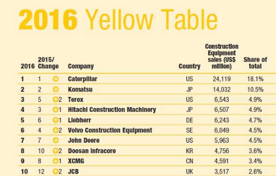 近日,世界領(lǐng)先的工程機械信息提供商——英國KHL集團主導(dǎo)發(fā)布了2016年全球工程機械制造商50強排行榜(Yellow Table 2016)。徐工集團、三一重工、中聯(lián)重科等多家中國企業(yè)均榜上有名,其中徐工集團(XCMG)排名第九,成為榜單上唯一一家躋身前十強的中國企業(yè)。