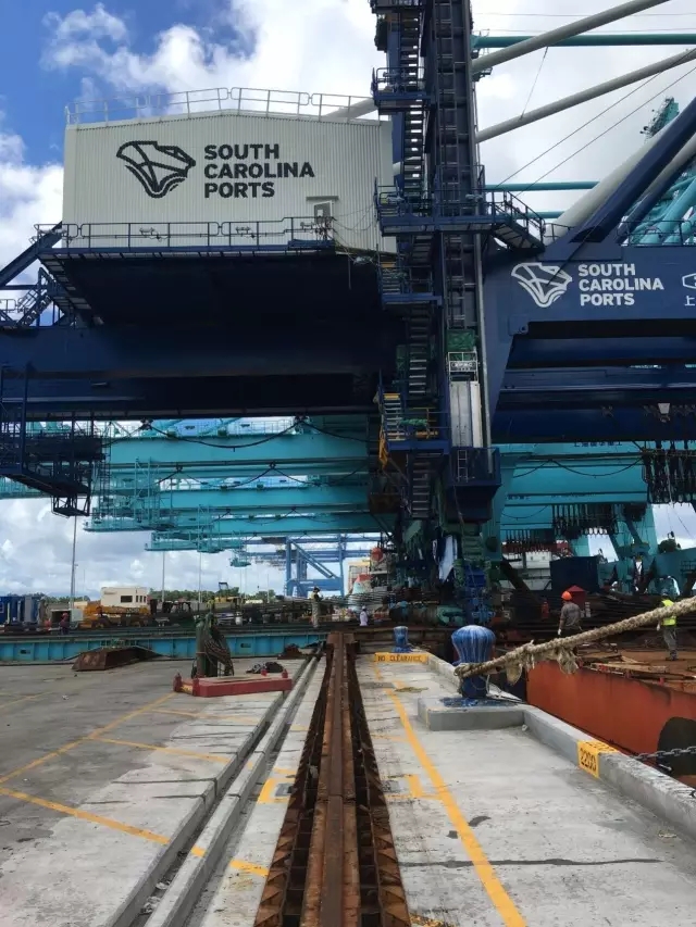 歷時(shí)2個(gè)多月,“振華14”輪首先到達(dá)查爾斯頓碼頭,卸下2臺(tái)岸橋;續(xù)航1天后至杰克遜維爾,卸下剩余3臺(tái)岸橋。