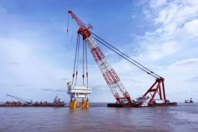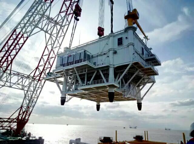 10月30日上午8時,經(jīng)過21個小時連續(xù)奮戰(zhàn),華能如東北區(qū)海上升壓站上部平臺吊裝到位。