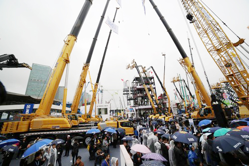 雖然下起小雨,但絲毫不減觀眾匯聚徐工展區(qū)的熱情