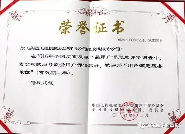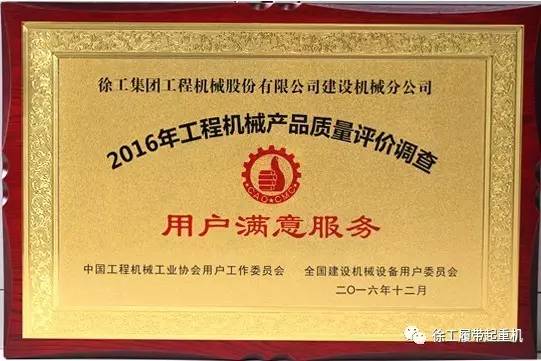 該調(diào)查根據(jù)國務(wù)院以及工信部相關(guān)政策制定,針對全國范圍內(nèi)的工程機械類產(chǎn)品質(zhì)量和售后服務(wù)狀況展開用戶滿意度調(diào)研,主要調(diào)查對象是近兩年的終端用戶、維保用戶、貿(mào)易租賃方和行業(yè)專家,從品牌形象、感知產(chǎn)品質(zhì)量、感知服務(wù)質(zhì)量、感知價值、綜合滿意度、用戶抱怨和用戶忠誠度等七個維度進(jìn)行系統(tǒng)評價。由于徐工履帶起重機產(chǎn)品質(zhì)量用戶滿意度及售后服務(wù)用戶滿意度評價較高,被中國工程機械工業(yè)協(xié)會用戶委員會授予“用戶滿意單位”及“全國用戶滿意產(chǎn)品”兩個獎項,并頒發(fā)“用戶滿意產(chǎn)品”、“用戶滿意服務(wù)”榮譽證書。